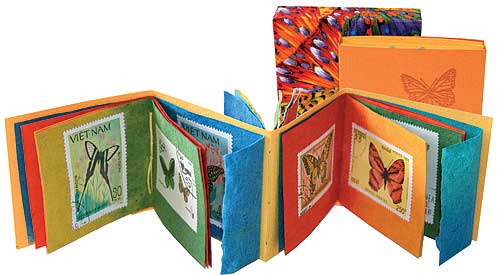 A bright, fun little book full of colorful butterflies depicted on actual worldwide postage stamps. Made of 3 alternating signatures of multihued handmade paper sewn on an accordion folded center. Thermal embossed butterflies on paper slip case and book cover. Butterflies Fly is 2.375” x 2.875” with 56 pages. Edition of 100, with hard slipcase $100, without slipcase $75.